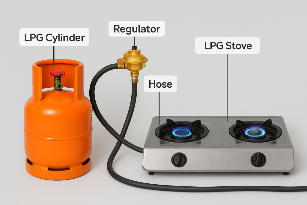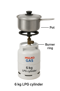 The 3kg and 6kg systems have fewer components than the rest of the systems. This is because the cooking is done at the cylinder top. For the bigger sizes, a complete LPG cooking setup normally includes: